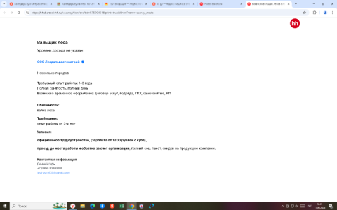 Сфера деятельности: Производство, промышленность; Специализация: Начальный уровень, мало опыта; Опыт работы: Нет опыта; Тип занятости: Полная занятость; График работы: Вахтовый метод; Вид организации: Работодатель;
